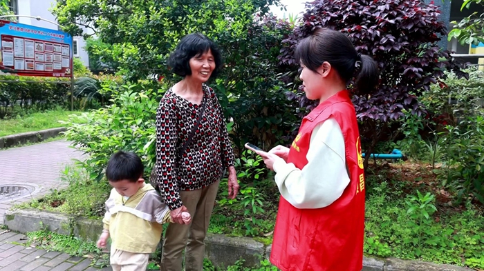 社区网格员正通过手机登录南平市城市体检信息采集平台收集居民关于社区改造后的意见和建议(林伯烟供图)