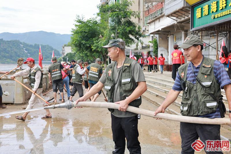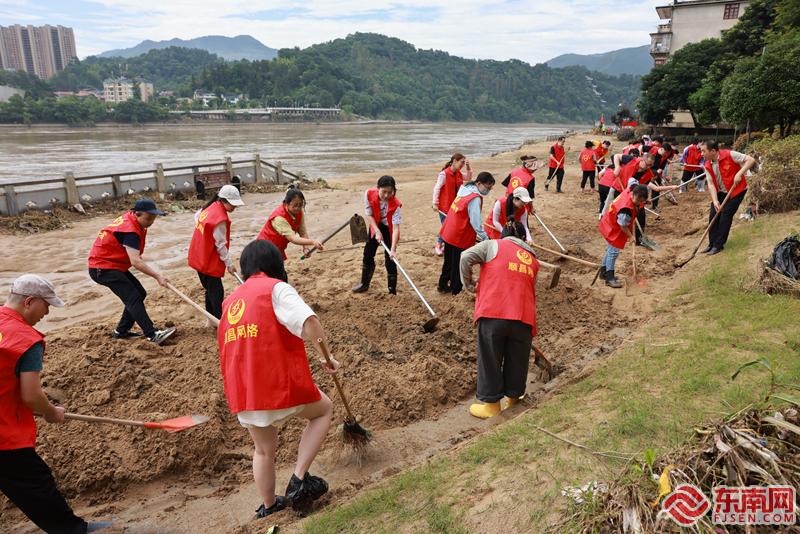 6月20日上午,顺昌县城关富屯溪沿江漫道上,顺昌县新时代文明实践中心志愿服务队和社会志愿服务队员们,正在忙碌着。一抹抹红色,同脚下的淤泥,溪上退去的洪水形成鲜明的对比,分外鲜艳。