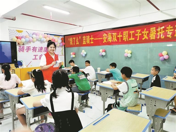 央视新闻频道对晋江市安海镇今年首期开展的新业态职工子女暑托专班进行了较为详细的介绍。考虑到外卖小哥、快递小哥、网约车司机等新业态群体全天奔波忙碌,孩子看护成了实际难题,晋江市安海镇总工会今年特别开设了新业态劳动者子女专班,这是晋江市安海镇首个面向新业态职工子女开设的专班。“今年这样,帮我们节省了一笔开支。”报道视频中,外卖员侯志炎现身说法。他介绍,往年因为暑期工作忙碌,无法照顾孩子,通常会花3000多元送孩子去托管班。今年,得知孩子只需交600余元餐费即可参加工会举行的暑托班,他第一时间就给孩子报了名。