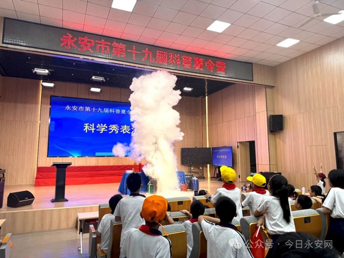 7月17日上午,永安市“童心向党,科学筑梦”公益科普夏令营正式开营。活动现场进行了航模表演、科学秀表演等精彩节目,在科学秀表演中,老师通过“展示+互动”的演绎方式,向同学们表演了各种神奇而又有趣的科学现象,激发青少年走进科学、学习科学的兴趣和热情。本次的科普夏令营为期三天,共有来自永安市11所小学的120名青少年参加。夏令营期间,营员们还将参加科普大篷车展品体验、创客小制作、无人机科普讲座、心理健康科普讲座等丰富多彩的活动,并实地参观三明市科技馆,进一步拉近孩子们与科学的距离,提升青少年科学文化素养。