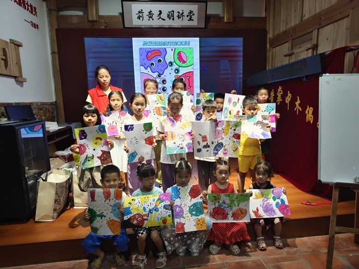 前黄村少儿兴趣班暑期班绘画课,学生展示绘画作品。泉港区前黄镇供图