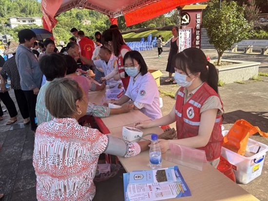 医务志愿者为村民量血压、测血糖。雷峰镇 供图