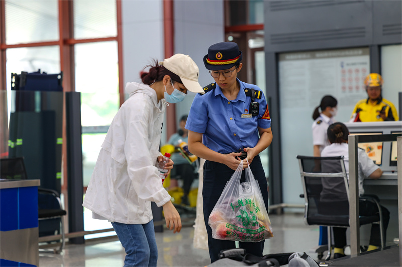 中国铁路南昌局集团有限公司福州车务段福清西站客运值班员程岩在安检口为行李多的旅客拿东西 (王勇富 摄)