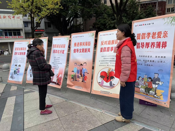 现场设置的移风易俗图展区,吸引群众驻足观看