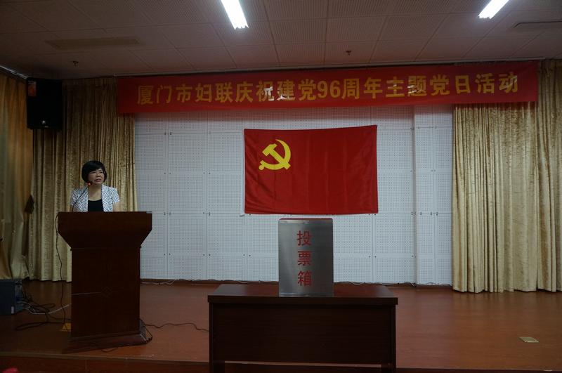 七月的阳光灿烂辉煌,七月的党旗鲜艳飘扬。7月3日上午,为深入开展“两学一做”学习教育常态化制度化活动,激励广大党员在“金砖我先行 发展当先锋”争先创优活动,厦门市妇联首个主题党日活动在市妇儿中心三楼会议室启动,全体党员以热烈而简朴的方式,共同庆祝中国共产党成立96周年。会议由厦门市妇联党组成员、副主席朱秀敏主持,市妇联党组成员以普通党员身份参加了主题党日活动,机关党总支部的全体党员、预备党员和入党积极分子共45人参加。