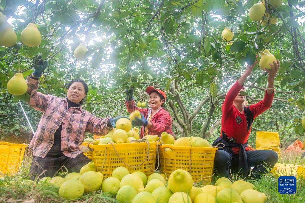 11月28日,在永州市道县梅花镇赤源村柚子种植基地,村民在收获柚子。新华社发(蒋克青 摄)