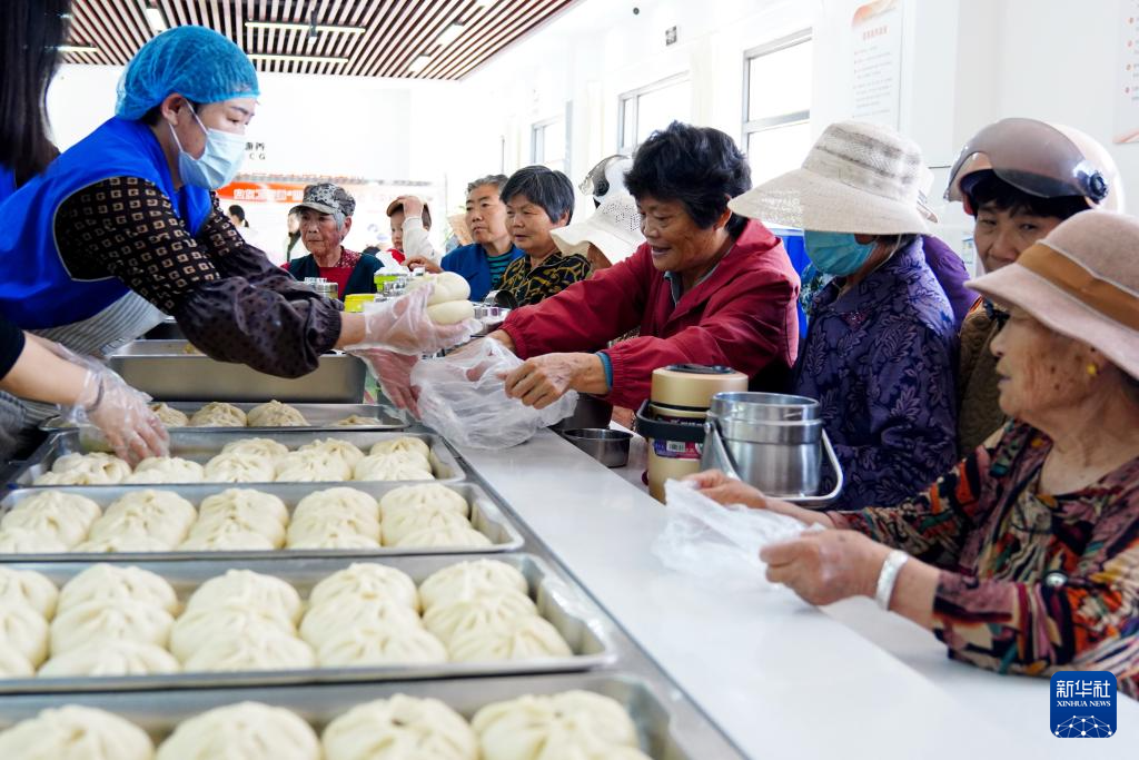 5月10日,在日照市岚山区安东卫街道凤凰山社区养老服务中心,工作人员为老人拿包子。 山东省日照市岚山区近年来积极探索新型养老模式,通过“区财政+村级集体+社会各界+老人子女”的共建机制,建设村(社区)级养老综合服务中心。养老综合服务中心配备休息室、就餐室、文体娱乐室、健身康复室和室外活动场地“四室一场”,为75周岁以上老人提供助餐、助医、助娱、助居家等综合养老服务。 新华社记者 郭绪雷 摄