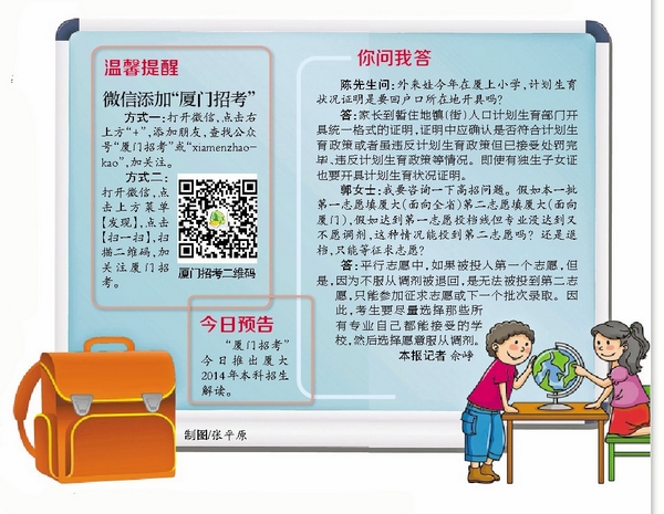 制图/张平原 你问我答 陈先生问:外来娃今年在厦上小学,计划生育状况证明是要回户口所在地开具吗? 答:家长到暂住地镇(街)人口计划生育部门开具统一格式的证明,证明中应确认是否符合计划生育政策或者虽违反计划生育政策但已接受处罚完毕、违反计划生育政策等情况。即使有独生子女证也要开具计划生育状况证明。 郭女士:我要咨询一下高招问题。假如本一批第一志愿填厦大(面向全省)第二志愿填厦大(面向厦门),假如达到第一志愿投档线但专业没达到又不愿调剂,这种情况能投到第二志愿吗?还是退档,只能等征求志愿? 答:平行志愿中,如果被投入第一个志愿,但是,因为不服从调剂被退回,是无法被投到第二志愿,只能参加征求志愿或下一个批次录取。因此,考生要尽量选择那些所有专业自己都能接受的学校,然后选择愿意服从调剂。 今日预告 “厦门招考”今日推出厦大2014年本科招生解读。 厦门日报讯(记者 佘峥 蔡萍萍) 昨日好消息传来:厦门各区教育局均派员“支援”本报的 “厦门招考”,共同为家有读书郎的您服务。 “厦门招考”是本报4日推出的教育类微信公众账号,它除了提供最及时、权威和详尽的教育资讯之外,还有一个“私人定制”的功能,即用户可以提问,本报记者进行“一对一”回答。 从头两天的运行情况看,这一“私人定制”尤其受到欢迎。为了使这一功能得到加强,昨天,六个区的区教育局应邀派出专人,和本报“对接”。今后,这个“智囊团”将作为“厦门招考”的强大后盾,为读者朋友们解答幼儿园、小学、中学等招生考试中“疑难杂症”。 我们也欢迎学校伙伴的加入,您可以通过“厦门招考”告诉我们。 4日开通的“厦门招考”在当天“一炮而红”之后,昨日继续“高烧”,粉丝和问题都直线上升。 温馨提醒 微信添加“厦门招考” 方式一:打开微信,点击右上方“+”,添加朋友,查找公众号“厦门招考”或“xiamenzhaokao”,加关注。 方式二:打开微信,点击上方菜单【发现】,点击【扫一扫】,扫描二维码,加关注厦门招考。 |