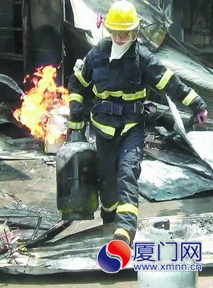 消防员从起火的小吃店内抢出液化气罐。