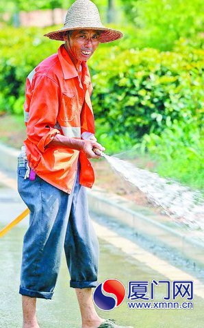 昨日下午,翔安大道完善工程现场,工人顶着高温正在焊接。