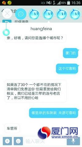 记者昨日与淘宝卖家的对话记录。 声音 汽车4S店: 无法提供号码清单 昨日,记者走访了岛内多家汽车4S店,试图请4S店提供具体的可选号码清单以方便挑选,但均遭到拒绝。4S店表示,“这不符合流程”。 一家4S店的客户经理告诉记者,自从她从事该行业起,车辆购置后,都是由客户提供意向号码,4S店会代为选号。如果客户的意向号码申请失败,4S店则会代为摇号,最后再由客户从所获的车牌号中“10选1”,获得最终的车牌号。 车主: 花钱选号没必要 一位业内人士告诉记者,有些车主喜欢选择对自己有特殊意义的号码当做自己的车牌号,如自己的生日等。所以,一些看起来并不属于“靓号”范畴的号码也很抢手。因此,“靓号”的界定十分困难,这也为车主们自主选号增加了难度。 而对于网上出售车牌信息一事,一些司机认为,“无所谓,感觉不至于会影响到行业秩序”。李先生说,家庭购车时他并未刻意去选择车牌号,“我认为花钱选车牌号并没有必要,年轻人毕竟不像老人那样迷信,车牌号看着顺眼就行了。” 厦门日报讯(文/图 记者 陈莼 实习生 陈婕 林铭鸿)“买了车就要为爱车选一个自己喜欢的车牌号码,但是进入车管所网站后,在规定的时间内没有选到自己喜欢的号码……现在有我们的帮助,再也没有这种惨状了!”最近,网上一种帮忙选车牌号的服务吸引了众多新车车主的关注。 车主反映 忙活大半天 选不到满意的号码 最近,刚买了新车的王先生打算在网上自主选号。可是一个上午忙活下来,王先生身心俱疲,“选了大半天都没选到心仪的号码,都是5454、9754这样差劲的号码,好的号码都被选走了!” 由于尝试多次,王先生的车架号被锁住,无法再次选号。无奈之下,他只能参与随机的“十选一”选号,“那十个号码看上去都不是很顺眼,但非选一个不可。”谈起这一次的选号经历,王先生非常郁闷。 记者调查 卖家称车管所有人透露车牌信息 与王先生的经历截然不同,新车主林小姐告诉记者,她在淘宝网上通过卖家提供的软件来选车牌号,选到了心仪的号码。 为了进一步了解情况,记者登录淘宝网界面输入“车牌选号”进行搜索,找到了460个“宝贝”。当记者将搜索范围缩小到“厦门车牌选号”时,网站也显示了10件“宝贝”,而且件件都有较高的评价。 在“宝贝”的说明中,卖家们都详细地解释了选号方式与过程,并明确指出,他们并不是卖车牌号的,而是为车主提供便利的查号服务,“就是查询目前车管所官方网站自编自选系统里还有哪些号码可供选择。”卖家们还保证,号码的可用性在九成以上。 “这些车牌号来源可靠吗?”记者随机询问了五个卖家,卖家们都表示,车牌绝对可靠,肯定可以用。有一个卖家甚至直接告诉记者:“这是车管所透露的车牌信息,也就是车管所内部有人拿到了这些信息。” 卖家还告诉记者,这些“靓号”信息大约三天更新一次,“绝对能满足顾客需求。”在“宝贝”评价中,记者发现这项服务获得了不少车主的青睐。 部门回应 网售车牌信息来自车管所并不属实 对此,市车管所相关负责人表示,网售车牌信息来源是车管所的说法并不属实。因为,所有自选车牌号信息都是通过互联网统一发布的,一次性投放一个号段,对所有车主都是透明公开的,根本不可能存在预留“靓号”的情况。 “其实,选车牌号就是一个‘先来后到’的意思。‘先到’的车主,就有更多选择空间。”这位负责人说,车主登录选号系统后,必须输入自己想要的号码,才能查询到车牌的相应信息。 |