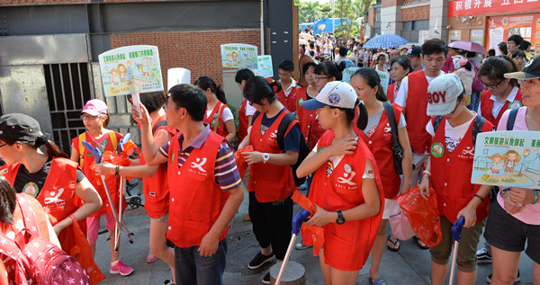 8月23日下午,近百名思明城市义工与城管执法队员一起走进曾厝垵文创村,分成数路,对商家违反“门前三包”的行为进行执法;对游客乱扔垃圾的行为进行劝导并向游客分发垃圾袋和小烟袋,宣传和倡导文明经商、文明旅游,共同维护美丽小渔村的良好环境。