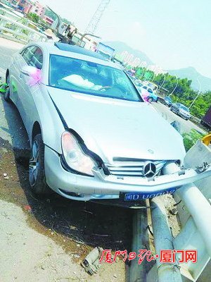 奔驰婚车扎进路边护栏。 厦门日报讯(文/图 记者 曾嫣艳)接亲的大奔驰,不幸与微型面包车刮了,新郎、新娘、伴郎等均不同程度受伤,本该意气风发的大奔,撞向护栏后,顿时趴窝,“前脸”毁容。 昨日上午11时左右,一辆大奔婚车在泉厦高速路往集美大道的匝道口处,失控一头撞向路边的护栏,左右后视镜上还绑着粉红装饰带。一边“骑”上护栏,大奔的前轴断裂,一边挂在护栏上,车轮高高挂起。比碗口还几倍粗的护栏,直插入奔驰车的左前大灯处。让奔驰车如此“发飙”的,是停在匝道口另一边的一辆微型小面包车,面包车的右侧身上有明显的撞击凹痕。 “奔驰与微型车刮擦后,撞向护栏。”这起撞击时机实在不对,奔驰车上的一对新人和随同人员“撞”进了医院。记者了解到,当时奔驰车上有新郎、新娘、伴娘、伴郎,连同微型车司机一共五人,都被送入市第二医院接受检查与治疗。幸运的是,五个人目前均无生命危险。目前,事故原因仍在进一步调查中。 |