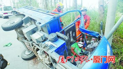 厦门日报讯 (文/图 记者 曾嫣艳 通讯员 陈占锋)13日下午2时15分,同安汀溪镇褒美村的一条山路上,一辆农用车侧翻后将一名男子压在车下。 大同消防中队官兵到场救援。出事地点位于一条崎岖的山路上,一辆农用三轮车侧翻在路边,路面上满是车侧翻后留在地面上的划痕。由于受到路边路障的撞击,三轮车的铁质驾驶室已经严重塌陷变形,一名男子被压在车下。男子的头部受到重创,两条腿也被压在车下,浑身上下满是血迹。因为一直没有找到解救男子的办法,一旁的医护人员只能先对男子的头部进行了简单的包扎,然后等待消防官兵的救援。 由于男子的头部刚好卡在农用三轮车的靠背架下,消防救援官兵上前扶正男子的头部,然后用力将压住男子的三轮车推正过来,并将该男子抬上救护车。 现场目击者称,此次车祸很可能是农用车下坡途中刹车失灵所致,事故原因仍在进一步调查中。 |