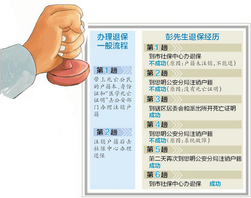 【办理退保一般流程】 第1趟:带上死亡公民的户籍本、身份证和“医学死亡证明”去公安部门办理注销户籍 第2趟:注销户籍后去社保中心办理退保 【彭先生退保经历】 第1趟:到市社保中心办退保 不成功(原因:户籍未注销,不能退) 第2趟:到思明公安分局注销户籍 不成功(原因:没有死亡证明) 第3趟:到辖区居委会和派出所开死亡证明 成功 第4趟:到思明公安分局注销户籍 不成功(原因:系统故障) 第5趟:第二天再次到思明公安分局注销户籍 成功 第6趟:到市社保中心办退保 成功