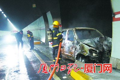 事故车一头“扎”进服务隧道,随后起火冒烟。 厦门日报讯 (记者 曾嫣艳 通讯员曾德猛)昨日中午1时37分左右,一辆轿车进入环岛干道金山寨隧道后,突然失控冲向隧道壁,一头“扎”进服务隧道口。就在大家赶到现场准备救援时,惊险的一幕再次发生:事故车的车头突然冒烟,“轰隆”几声响后,车子瞬间被大火吞噬,紧接着隧道内浓烟四起……等浓烟排尽,灭火结束,救援人员在事故车辆内发现了一具尸体。 救援现场 轿车烧成火球 隧道内浓烟滚滚 昨天下午2时许,环岛干道金山寨隧道内不断冒出黑烟,黄厝往厦大方向的双向隧道口都被封闭。此时,过往车辆不多,救援人员引导车辆绕行。 浓烟来自隧道内一辆已烧成火球的汽车。事故发生在往厦大方向的隧道内,距离出口仅一百米左右。这辆车在隧道内靠上李一侧的路段突然失控,一头撞向隧道边,一头“扎”进双向隧道之间的服务隧道口。消防员接警赶到时,隧道内已被浓烟笼罩,漆黑一片,伸手不见五指。 因隧道内浓烟弥漫,第一辆进入的消防水罐车被迫退到隧道外。随后,陆虎雪炮排烟车和隧道救援抢险车陆续进入隧道内施救。特勤消防二中队的消防员表示,隧道里能见度极差,什么都看不到,陆虎雪炮排烟车在下风方向排烟,同时隧道救援抢险车慢慢深入隧道深处,扑灭起火的部位。当时,大火还引燃了隧道底部的管道,消防员先用水枪扑灭外部的明火,随后又用泡沫水枪,对事故车内的明火进行覆盖。 事故回放 轿车失控撞墙 车头突然冒烟起火 将火扑灭后,救援人员勘查事故车时,发现里面有一具烧焦的尸体。死者坐在驾驶座上,上半身“挤”进驾驶座及副驾之间的位置,往后仰着头。出事的是一辆“众泰”SUV。由于火势猛烈,车子被烧得面目全非,车身只剩铁架,四只轮胎及车后的备用胎,都只剩下轮毂。 从市公路桥隧维护中心的监控视频可以看到,撞向隧道壁时,这辆车并没有马上起火。此时路过的车辆并不多,桥隧值班人员发现情况后,立刻通知110中心,警车从出口处逆行进入事故地点。就在众人围着车子准备展开救援时,事故车的车头突然冒烟,火瞬间吞噬了整辆车。工作人员从隧道内找来灭火器,想将明火扑灭,无奈火势太大,只好将警车开远,组织其他车辆疏散。昨天中午1时59分开始,隧道内被大量浓烟笼罩。 昨日下午,“@厦门警方在线”官方微博通报了这起事故。警方称,昨天下午3时,明火被扑灭,交警对现场展开勘查。经初步调查,事故车辆为一部黑色“众泰”SUV,当场死亡的驾驶员陆某今年56岁,男性,厦门人。 目前,交警等有关部门正在对事故原因做进一步调查。 提醒 隧道内遇险情 往服务隧道跑 在昨日的事故中,一名过路车主见势不妙,赶紧将车停在附近车道,弃车逃生。市公路桥隧维护中心表示,这样的自救逃生方法是正确的。隧道里一旦发生火灾,对人危害最大的不是明火,而是带有毒性的烟雾。起火后四五分钟,隧道内迅速被浓烟笼罩,视线很差,这时逃生是最重要的,隧道内有服务隧道,逃生者可以通过人横通道,往隔壁的服务隧道跑。记者还了解到,环岛干道隧道内都配有灭火器,这都是方便驾驶员在火灾初期时候灭火自救。 消防部门表示,起火后生成的浓烟是对人和车最大的威胁。隧道一般为封闭式通道,如果烟雾没有及时排出,滞留的烟雾会顺着风向往下风区扩散,所以下风区是最危险的区域。这时,人要根据烟飘的方向,捂住口鼻,赶紧往上风区逃生。 回顾 车辆隧道起火 近年时有发生 2014年5月22日,同安西柯镇潘涂村天马山隧道往集美方向,一辆大货车后车斗上的货物突然起火。司机将车开出隧道后,将车停在出口变道带,下车报警。 2013年6月5日凌晨,漳州华安新圩镇浦尾水电站的一处在建隧道内,一辆水泥搅拌车车头突然起火,浓烟弥漫了整个隧道。发现车头起火,且火势越来越大,搅拌车司机冲下车,招呼正在隧道内施工的10多名工友紧急逃到隧道口。由于处置及时,没有造成人员伤亡。