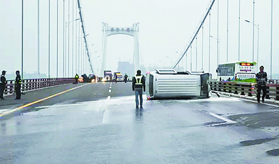 轿车车身受损严重。 ■昨日凌晨5时发生的这起事故,致一死三伤■大桥进岛方向拥堵,10时车辆恢复正常通行 厦门日报讯(记者 程午鹏 曾嫣艳 何炳进 通讯员 骆洋 曾德猛黄洁)一起4分钟内发生的追尾事故,导致1人死亡,3人受伤。海沧警方快速处置,启动联动机制抢救伤员,疏导交通。 昨日凌晨5时13分到5时17分,这起事故发生在海沧大桥进岛方向桥面,导致海沧大桥进岛方向严重堵车,一直到上午10点才恢复正常通行。 轿车追尾牵引车 警方迅速抢救 根据海沧警方通报情况和监控录像截图,凌晨5点13分,海沧大桥出岛方向左起第三条车道,一辆凯美瑞轿车追尾,撞在前面一辆牵引车的右侧尾部。凯美瑞小轿车撞击后,偏向右侧,撞击大桥护栏后停下。5点17分,一辆微型面包车原本在左起第二条车道行驶,但撞到地面散落的杂物,最终侧翻在地。 在现场,黑色凯美瑞小轿车车顶整个掀开,车身碎片散落一地;牵引车车头、车尾损坏;微型面包车侧翻,车头严重凹陷。 海沧兴港消防中队官兵赶到现场后,立即用泡沫覆盖地面泄漏油污,用水枪稀释车辆泄漏的油。消防官兵从变形的凯美瑞小轿车内救出一名驾车男子,但已死亡;微型面包车上的一家三口也被送往医院抢救治疗。 一家三口上路 不料遇上车祸 记者在中山医院肝胆科见到了事故中受伤的蔡先生一家三口,蔡先生右肩膀脱臼打上石膏,他的妻子手臂有些酸痛。受伤最重的是蔡先生12岁的儿子,他受到撞击导致肝破裂。 蔡先生说,当天凌晨,他们从龙海驾车进岛准备批发一些水果。原本只有他和妻子,但儿子不愿单独在家,只好一起带上车。他驾车经过海沧大桥时,天还没全亮,车前突然出现一个轮胎,他打方向盘躲避不及撞上导致翻车。蔡先生和妻子坐在车子前排,儿子在后排座位睡觉,翻车后被安全带勒住,伤得不轻。蔡先生说,儿子正在上小学六年级,本来第二天开学,没想到飞来横祸,没法去上课了。 目前,蔡先生的儿子成功接受手术治疗,但仍需住院观察。 疑因车距太近 导致事故发生 事故发生后,海沧警方通过官方微博公布初步调查情况。据了解,已死亡的凯美瑞小轿车驾驶员姓陈,为厦门人,今年30岁。 根据警方通报的消息称,事发时,黑色凯美瑞小轿车追尾前方一辆重型半挂牵引车,导致车辆失控撞向护栏,车辆轮胎和零部件等物品散落桥面。微型面包车经过事故现场因躲避路面散落物不及,面包车侧翻。 警方初步认定,凯美瑞小轿车驾驶员陈某驾驶车辆时,未与前车保持安全距离。目前,事故调查、后续处理还在进行中。 海沧交警提醒大家,这起事故发生时,事发路段车辆并不多,本可以避免,广大驾驶员应保持合理车速,预防事故发生。 【链接】 封路遇上早高峰 小事故又“添堵” 昨日早晨,海沧大桥进岛方向因事故道路临时封闭后,很快遇到了车流早高峰,大量车流滞留桥上,连杏滨路往杏林大桥方向也出现堵车。与此同时,岛内的仙岳路高架桥、东渡路往海沧大桥出岛方向,也出现不同程度拥堵状况。 8点30分许,海沧大桥进岛方向靠近大桥桥墩处快车道上又发生事故。9时许,事故车辆被拖离海沧大桥后,临时封闭的进岛路面重新开放,但由于之前“积压”了大量车流,通行比较缓慢。半小时后,海沧大桥进岛方向又有两车追尾,导致后面的车辆排队缓行。拥堵情况持续到上午10点多,“积压”的车流才逐渐“消化”。 |