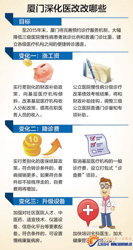 黄劲超 制图 海西晨报讯(记者 袁青青 通讯员 黄光华)厦门市深化医改即将开始。昨日,厦门市公立医院动员会暨分级诊疗大会召开。厦门市卫生计生委主任杨叔禹说:“厦门深化医改,老百姓和医务人员都将受益。” 厦门的慢性病分级诊疗模式,已得到国务院医改办和国家卫生计生委高度评价。接下来,厦门将完善预约诊疗服务。至今年末,将大幅降低三级医院慢性病患者就诊比例和普通门诊比重,在各级医疗机构间,建立便捷的转诊通道。 基层医护人员将涨工资 “国内大部分医务人员的收入不高,但工作强度很高、压力很大。”杨叔禹介绍,此次厦门深化医改,要让医护人员受益,释放他们的积极性。 记者获悉,厦门将实行差别化的财政补助政策,重点将向基层医疗机构倾斜,还将改革基层医疗机构收入分配,提高在职医务人员收入水平。 同时,厦门还将在公立医院建立,慢性病分级诊疗改革绩效考核结果和财政补助挂钩的机制,调整三级公立医院普通门诊量和专项补助。 实行差别化的医保结算 在深化改革的过程中,厦门将发挥医保对就医的引导,实行差别化的医保结算政策。这意味着,高血压、糖尿病、心脑血管疾病、肿瘤、慢性肾病等疾病患者,符合从基层医疗机构转诊到上级医院或符合由上级医院转到基层医院治疗的,看病可报销的费用更多。如果符合条件却不按程序走的,自费费用将增加。 值得一提的是,厦门还将取消基层医疗机构的“一般诊疗费”,设立从看病到开药的打包式“诊查费”项目。 升级基层医院硬件设备 “大医院愿意放,同时病人要愿意,社区也要接得住。”厦门大学附属中山医院院长蔡建春认为,要全面提高基层医疗机构的服务能力。 此次厦门进一步推进慢病分级诊疗试点改革,将加强对社区医院人才、中医药、适宜技术、仪器设备、信息化平台等要素的配备,有条件的还可设置慢性病康复病房。 “去年,有中医参与的所属四个社区服务中心门诊量达40万人次。”厦门中医院院长陈进春说。记者得知,厦门还将完善“中医专家进社区、中医专家社区师带徒”等“强基层”措施。 目前,厦门一万个人配备的全科医生不足一人。对此,厦门也将加快培训全科医生,加大健康管理培训师力度。 |