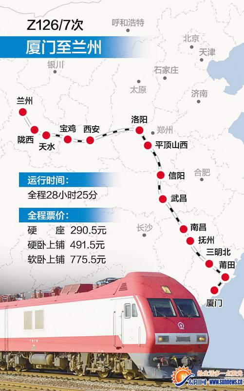 海西晨报讯(记者 雷妤 通讯员周溶冰)今年5月20日铁路运行图将微调。本次调图,厦门将首开至兰州的直达特快列车,全程运行28小时25分。 厦直达兰州特快将开通 据悉,厦门—兰州列车将于5月20日首发,车次为Z126/7次,返程车次为Z128/5次,该列车经由杭深、永莆、昌福、京九、武九、京广、漯宝、焦柳、陇海线运行。 根据时刻表,Z126次于7:05从厦门站始发,次日11:30到达兰州,全程运行28小时25分(详见左图)。全程票价:硬座290.5元、硬卧上铺491.5元、软卧上铺775.5元。 该趟列车的开行,使旅客可以从厦门深入西北腹地,到西安的时间也从近40个小时大幅缩减到21个小时左右。市民还可乘此列车直达宝鸡、天水、洛阳等历史名城。另外,搭乘此列车到兰州,并通过兰新高铁中转前往青海、新疆等地也将更便捷。 厦门到北京提速15小时 此外,本次调图后,厦门—北京西K308/5、K307/6次快速旅客列车提升等级为直达特快列车,车次改为Z308/7,并改经杭深、永莆、昌福、昌九城际、京九线运行,不再停靠漳州东、漳平、永安、三明、邵武、资溪、鹰潭、潢川、亳州、商丘南等站,新增莆田、三明北、抚州、南昌西停靠站。全程运行18小时32分,较原运行时间缩短15个小时。票价也有所下降,全程票价硬座240元、硬卧上铺408元、软卧上铺640元。 目前厦门至兰州、北京西的直达车车票已可以通过互联网、电话订票,车站、自助售票机及代售点售票窗口则于今日开始发售。 |