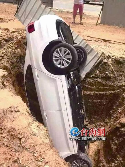 东南网6月8日讯(海峡导报记者 房舒)小车头朝下,“插”在泥坑里。昨日下午1:20左右,集美后溪新村路段,发生这样一起事故。 连日阴雨天,让原本的土坑变成了泥坑。事发地,后溪新村路段正在施工,这个深坑就在路边。“看到一个女司机从车里爬出来。”一名目击者回忆,这是一辆崭新的大众捷达轿车。车子栽下去后,前面两个门都被压住了,女司机挪到后面,从后座位置爬了出来,看起来人没什么事。 旁边,有一块被撞坏了的铁皮。现场的人说,本来这是用来围挡这个坑的,被车硬生生撞开了。 大家推测,可能女司机对附近路况不熟,也不清楚铁皮后面是什么。而女司机也说,附近没有什么警示标志,一不小心就掉下去了。 不过,这些说法都尚未得到证实。警方已介入调查。 |