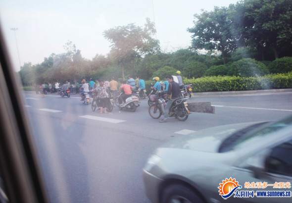 18:43,“摩托车大军”在等待交警下班。