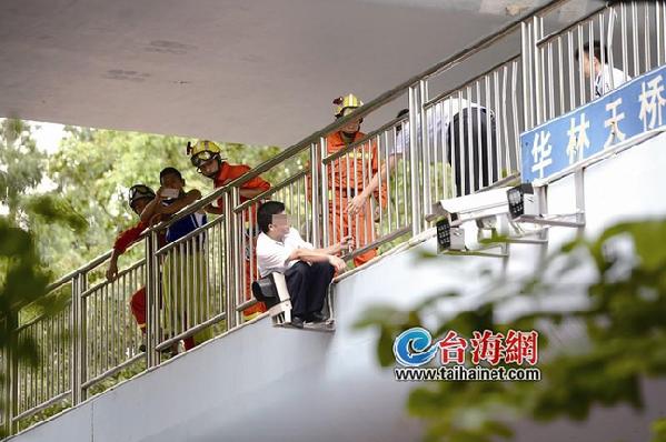 男子蹲在天桥外的支架上,救援人员正在劝说 东南网7月28日讯(海峡导报记者 林利萍/文 梁张磊/图)“你有什么困难?我们会帮助你!”天桥上,数名民警围着一名男子耐心劝说。 昨日上午10点左右,莲前东路华林天桥,一名年轻男子站在天桥外的支架上。民警、消防人员、120赶来,经过1小时劝说,男子放弃轻生念头。 男子站在天桥外的支架上 上午10点半,导报记者赶到华林天桥下。 此时,一名穿白衬衫的男子站在天桥外面悬挂监控设备的支架上。支架仅20多厘米长、10厘米宽,难以承受男子的重量,被压弯了。 男子时而站立,时而蹲下,手搭在天桥的护栏上,情绪十分低落。 莲前东路往会展方向的内侧两车道无法通行,天桥下放着一块救生气垫,消防人员紧紧拉着稳固气垫的长绳。民警、120也来了。 天桥下不少群众围观,议论纷纷:还这么年轻,有什么事想不开呢? |