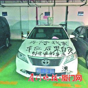 厦门晚报讯(文/图 记者 朱俊博)私家车位被邻居的小车占据,车位主人贴小纸条告知无效后,拿着墨水将小车引擎盖写满大字泄愤。昨日上午,此事发生在海沧海晟维多利亚小区。 昨日上午8点左右,家住海沧某小区的李女士下到地下车库开车时,发现在一个车位上面停着的白色丰田小车,引擎盖上被涂满了墨水,上面写了几个大字:“再停我家车位后果自负,到底谁的车,滚。” 记者联系到物业部门,负责地下车库安保工作的谭姓班长告诉记者,这个车位是该楼31层一户业主所有,而丰田小车则是7楼的一位业主家的,两家的小孩是同班同学兼同桌,两家主人彼此都认识。 “车位的主人前段时间出差在外,车位没用,就同意让丰田车停放,结果他们上周回来后,丰田车还是停在这边没有挪走,车位用不了,31楼那户业主就很生气,贴了纸条告知没用后,今天就涂墨水撒气。”谭班长说,事情发生后物业马上介入,联系到两户人家进行协商,现场两家人虽然都有气,甚至还差点动起手来,还好物业居中调停制止了冲突的发生。 谭班长说,其实这辆丰田车也是有租车位的,但车位在其他楼层的下面,停完车再走过来需要一段路程,结果小车主人就放着租好的车位不用,占据了别人的私家车位,这才是矛盾的根源所在。“后来我们调解了一下,双方也相互道歉,保证不再发生类似事情,我们再帮忙把车清洗过,这件事就结束了。” |