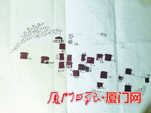 杨松坡与儿子共同画出了当年的东宅村地图,每家每户都标上了名字。