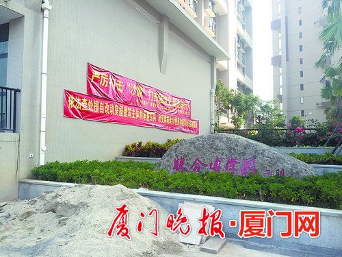 联合博学园小区门口挂着“打击强迫违法交易行为”和“查处违法装修现场”的条幅。