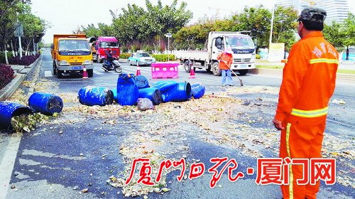 路面养护人员正在清理垃圾。 厦门日报讯(文/图 记者 黄小芳)真臭!隔着十来米远,就闻到阵阵恶臭,混杂着酸味、霉味、腐味、腥味。昨日中午12时30分许,小货车一头贴向了拖头车的“冷屁股”,导致12桶泔水倒了一地。8名路面养护人员为清理这些垃圾,花了近3个小时。 事发五通灯塔公园门口的环岛东路。记者在现场看到,12个泔水桶横七竖八躺在路上。路人纷纷绕道而行,连声抱怨“臭死了”。随后,记者从警方处了解到,之所以会一地残羹剩饭,是因为一辆小货车撞上了停在路边的拖头车,小货车司机有受伤,具体情况还有待进一步调查。 |