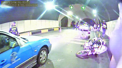 警车被撞倒。(监控截图) 厦门日报讯 (文/图 记者 汪长福 通讯员刘海燕)昨天凌晨1点50分左右,一名男子酒后开车途经仙岳山隧道,发现前方有民警设卡查酒驾,该男子竟然加快车速,连闯三关,冲撞警车后疯狂逃逸。 此事引起湖里警方高度重视,民警根据车牌等信息,一个小时锁定嫌疑人。昨日下午3点50分左右,民警在仙岳医院成功抓获嫌疑人刘某某。原来,担惊受怕的刘某某当时去医院检测血液,想了解自己的酒精含量,结果被民警逮个正着。目前,刘某某因涉嫌妨害公务,被警方刑事拘留。 男子驾车连闯三关 轮胎瘪了还继续逃 昨日凌晨,湖里交警大队民警在仙岳隧道靠南山路的出口设卡查酒驾。1点50分,一部泉州牌照的黑色小车,由仙岳路拐进隧道,往南山路方向行驶。 “当时我们已经注意到这部车子,驾驶员突然往后开,想逃避检查。”交警描述,发现这个情况后,执勤人员立即驾车堵住这部车子的后路,“这个驾驶员没办法后退,竟然开始加速冲关”,在距离设卡点近百米的距离,开车男子不仅没有减速,反而加快车速往前冲。交警在前方设置了三道关卡,第一关是警示牌,第二关是警用摩托车,第三关是阻钉带和警车。没想到,该男子连闯三关,冲过阻钉带,撞上警车,三个轮胎瘪了之后还疯狂逃逸,交警立即开车追赶。 随后,交警向110指挥中心说明情况,警方立即启动应急预案。很快,湖里刑侦大队有组织犯罪侦查中队成立专案组,立即展开调查。 |