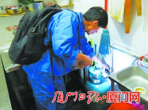 餐饮场所专职安检员在小吃店里检查燃气设施。(殷磊摄)