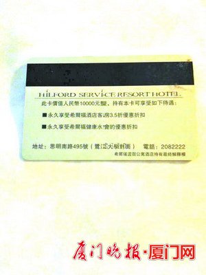 洪女士提供的会员卡上标明可“永久享受”。 厦门晚报讯(文/图 记者 匡惟)“花1万元买的酒店住房卡,说好无限期可以使用60次。没想到才用了33次,酒店就说协议上盖的公章是假的,不让住了。”近日,市民洪女士致电本报市民热线,对酒店的这一做法表示不满。 洪女士说,最后一次使用住房卡是今年5月19日,11月份再次使用就不允许了,而酒店对此的解释是当时酒店属于“失控状态”。目前工商局已介入调解,但仍无结果。 【意外】 已经使用好多次的卡为什么突然不能用了 洪女士说,2006年为海外亲戚订了希尔福酒店,住了一晚后感觉不错,于是花1万元买了一张住房卡,双方签订了“厦门希尔福酒店会员卡协议”。根据协议,洪女士一次性缴纳会员费人民币1万元,即可免费入住酒店豪华标间及豪华单人间60次,另注明入住无年限,住满60次为止。 2013年,希尔福酒店改成了和驿家酒店。洪女士与酒店方协调后,和驿家酒店接受了这张住房卡,洪女士的亲戚也曾入住过几次。5月19日最后一次使用后,这张住房卡还剩27次。 今年11月,和驿家酒店又改回了希尔福酒店,洪女士再次办理入住时被拒绝了。她很诧异:“和驿家酒店都能使用的住房卡,改回希尔福酒店后反而不能用了?”她说,酒店负责人对此的解释是,当年签订协议时盖的是市场营销的章,不是对外公章,所以这份协议无效。 |
