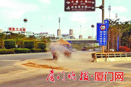 同安湾大桥下方路口,土方车后方腾起黄雾。