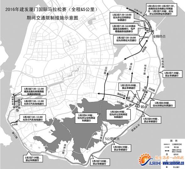 厦门网-海西晨报讯(记者 陈小斌 通讯员周永宁)2016年1月2日(星期六),2016建发厦门国际马拉松赛将在厦门正式举行。昨天,记者从厦门市交警支队获悉,为确保比赛顺利进行,2016年1月1日20点至1月2日16点期间,将对厦门部分道路采取分时段交通限制措施(详见上图)。本次交通管制涉及的路段较多,建议市民朋友出行前提前做好安排。 此外,为尽量降低对市民的出行影响,厦门市交警支队将根据比赛进展情况,适时恢复管制路段的交通。同时,也提醒广大市民要详细了解道路交通限制情况提前做好出行安排。 |