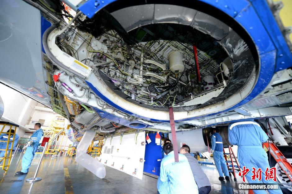 在C检维修中,既要对飞机内、外部,驾驶舱和发动机做彻底目视检查;还需打开机翼、机身口盖做清洗、润滑和防腐;更要对影响飞行安全的主要电子和机械系统通电通液压测试;并按需对飞机进行系统线路改装,必要时还需要进行飞机试飞工作。 2015年厦航本部基地共完成C检飞机数量49架次、A检飞机数量361架次、零散工作数量5400项。图为机务对发动机进行维护。 王东明摄