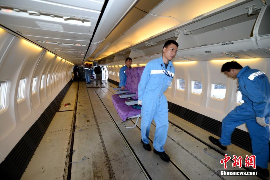 在C检维修中,既要对飞机内、外部,驾驶舱和发动机做彻底目视检查;还需打开机翼、机身口盖做清洗、润滑和防腐;更要对影响飞行安全的主要电子和机械系统通电通液压测试;并按需对飞机进行系统线路改装,必要时还需要进行飞机试飞工作。 2015年厦航本部基地共完成C检飞机数量49架次、A检飞机数量361架次、零散工作数量5400项。图为机务对机舱进行维护。 王东明摄