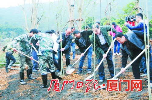 党员干部在新民镇西山郊野公园植树。 厦门日报讯(文/记者 卢漳华 吴耀东 通讯员 杨心亮 图/通讯员 陈嘉新)惊蛰节气刚过,春回大地,万物复苏,正是植树的好时节。昨日,是一年一度的植树节,同安区上下掀起了一场场火热的植树热潮,干部群众身体力行,为“富美同安”添新绿,增新景。 西山公园喜添新装 卷起袖子、抡起锄头、挥铲填土、围堰培土。昨日上午9点,新民镇西山郊野公园现场,没有什么壮观的开种仪式,来自同安区直机关各办及同安区绿化委成员单位的120多位干部在这里掀起了火热的植树高潮,他们在一个多小时内在这里种下了福建山樱花、凤凰木、美人树等200多棵和大片的竹林。 同安区农林局副局长王建愿告诉记者:“今天在西山郊野公园种的树以花、香为主,主要树种是福建山樱花、凤凰木、美人树,都是会开花的树种,而且带有一定的香气,福建山樱花比日本樱花花期更长,她的花期可长达两个月,此外凤凰木作为厦门的市树,红得惊艳,也是我们选择种植的原因,美人树在绿化及市政花卉的选择上也比较受青睐,所以在郊野公园中种有花、有香气的树,西山明年就添了新姿。” 这样大面积义务植树的场景不仅仅在同安新民西山郊野公园。昨日,在同安的其他镇街同步进行着类似这样的植树活动。据悉,此前,市委宣传部也已组织机关人员上军营村进行义务植树。 |