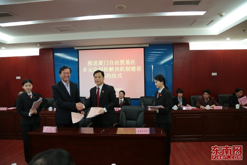 东南网4月19日厦门讯(本网记者 卢超颖)今日上午,推进厦门自贸区多元化纠纷解决机制建设签约仪式在厦门湖里法院举行。 此次,湖里法院自由贸易区法庭与厦门贸促会调解中心、厦门市知识产权局维权援助中心、厦门国际商事仲裁院、厦门国际商事调解中心(以下简称仲裁委仲裁委“一院一中心”)、厦门市质量技术监督局稽查支队、厦门市保险行业协会保险纠纷调解委员会、厦门市银行业协会等6家机构分别签署了诉讼与非诉讼衔接工作机制合作意见。 记者从签约仪式上获悉,此次签约的一揽子合作意见搭建了关于涉自贸区商事纠纷的多元化纠纷解决平台。 今后,涉厦门自由贸易区的国际商事纠纷、知识产权纠纷、产品质量商事纠纷、保险等金融纠纷发生后,只要当事人同意,不管是诉前,还是诉中,都可以通过多元化纠纷解决平台,选择向厦门贸促会调解中心、厦门市知识产权局维权援助中心、仲裁委“一院一中心”、厦门市质量技术监督局稽查支队、保险纠纷调解委员会、厦门市银行业协会等非诉讼途径申请调处纠纷。达成调解协议的,可以向自贸区法庭申请司法确认,赋予非诉调解协议法律执行力。若是调处不成,自贸区法庭则会及时启动诉讼程序,保障当事人诉权。 除了针对具体案件的“诉调衔接”之外,湖里法院自贸区法庭还与上述六家机构建立了联席会议和日常联系人制度、工作对接和人员互动制度、信息交流和调研研讨制度等三项工作机制,确保了多元化纠纷解决机制的顺利运行。 另据了解,湖里法院自贸区法庭还聘任了14名来自厦门仲裁委、厦门贸促会等专业机构的特邀调解员。特邀调解员将利用他们的专业知识背景为涉自贸区商事纠纷的解决提供帮助。 厦门仲裁委常务副主任兼秘书长林建文表示,合作意见的签订使诉讼与仲裁、调解互相衔接,在人民法院的审判职能主导下,充分发挥商事仲裁、商事调解机构专业化、国际化的优势,及时妥善化解商事纠纷,能够更好地服务于厦门自贸区的发展。 厦门中院副院长吴丽雪代表市中院讲话,期待各方在更高起点上积极构建诉讼与非诉讼相衔接的矛盾纠纷多元解决机制,探索形成可复制、可推广的经验,切实将其打造成为厦门法院司法改革的一大亮点、服务保障自贸区建设的一项品牌。