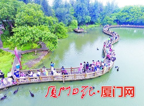 昨日上午,在厦门五缘湾湿地公园,市民和游客在木栈道上与黑天鹅零距离接触。(记者王火炎航拍器摄)