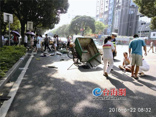 东南网6月23日讯(海峡导报记者 房舒)昨日上午8点多,豆仔尾路和湖滨南路路口,一辆三轮清洁车被连人带车撞翻。 肇事的是一辆出租车,前挡风玻璃碎成了“蜘蛛网”。三轮车车头翘了起来,倒在地上,骑车的清洁工摔在地上。清洁工是一名中年男子,豆大的汗珠从脸上流下来,他不住喊疼。 据知情者介绍,三轮车被撞之后,清洁工还弹了起来,才摔到地上。出租车司机则说,当时他以每小时50多公里的速度前行。没想到,突然从斑马线一端窜出这辆三轮车,他来不及刹车。 经过检查,清洁工头部和左腘窝裂伤,随后被120送往医院。交警正在对事故具体原因展开调查。 |