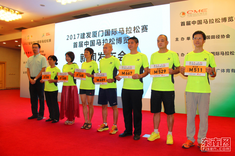 组委会为赞助商代表授予荣誉奖杯,为新增永久号码簿的跑者授予号码簿。有八个已经连续参加厦马14年的跑者被邀请到场,厦门国际马拉松赛组委会为其颁发15年荣誉号码簿。