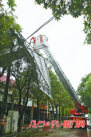 另一块大铁皮的处置求助发生在“鲇鱼”登陆之后。28日上午,翔安新圩镇新霞路菜市场路口,一块十几平方米的铁皮挂在电线杆顶端,随时有掉落的危险。马巷消防中队中队长曾迪带队赶到后,上云梯车在高空操作,直接剪除外围悬空的部分铁皮,让它掉落到地面。靠近菜市场的另外半块铁皮,用吊车转移到地面上。
