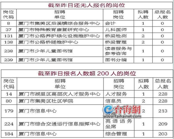 东南网10月14日讯(海峡导报记者 钱玲玲)厦门今秋事业单位招聘,还有最后2天报名时间。截至昨日,共有14236人在网上报名,但其中已有5368人未通过资格审核,被刷了下来。 本次招聘,市属和部分区属事业单位共设置了283个岗位,总共招聘332人,初定于11月19日上午笔试。 报名通道将于10月15日17:00关闭,还有意报考的,要抓紧最后两天登录厦门市人力资源和社会保障局(厦门市公务员局)事业单位招聘频道(syzp.xmhrss.gov.cn或syzp.xmrs.gov.cn)报名平台报名。 5个岗位已超200人报考 导报记者注意到,目前,有45个岗位的报名人数已突破100人;其中,有5个岗位的报名人数已超过200人。 最为热门的,是湖里区高层次人才服务中心“人才服务”一职和集美区招生委员会办公室“信息员”一职,总报名人数都已达到228人。不过,前者只招一人,竞争更加激烈,后者计划招两人。 从招聘单位看,厦门市信息中心最“红”,其“产业项目管理”和“综合管理”两个职位的报名人数都已突破200人。 还有6个岗位无人报考 与炙手可热的上述岗位相比,也有不少岗位备受冷落。 其中,有6个岗位还无人问津。分别是:集美区后溪镇综合服务中心“会计”、厦门市特殊教育康复研究中心(心欣幼儿园)“儿科医师”、厦门市公路养护绿化设施维护中心“桥梁检测”、厦门市公路桥隧维护中心“桥梁管理”、厦门市少年儿童图书馆“读者服务与参考咨询”“图书分编”。 同时,还有44个岗位的报名人数维持在个位数。如果您还有意报考,不妨多看看这些冷门岗位,“中签率”或许会更高。 |