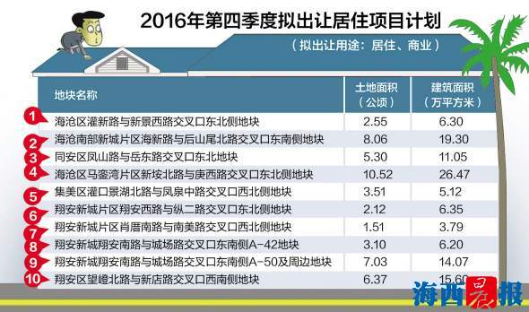 2016年第四季度拟出让居住项目计划 海西晨报讯 (记者 曾昊然)每次有商住用地出让,都会吸引市民的关注目光。日前,市国土房产局公布《2016年第四季度拟出让居住项目计划》,厦门第四季度拟出让10宗商住用地,本次推出的地块均为岛外用地,岛内零供应。 根据计划,含10月27日已发布公告的海沧、同安的3宗商住用地,第四季度共有10宗商住用地拟推向市场,总土地面积50.07公顷,总建筑面积为114万平方米。 记者注意到,这10幅地块均位于岛外。拟推用地中,翔安拟推地数量最多,共5幅,总建筑面积46.01万平方米,占到全市出让土地总建面积约40.36%。海沧拟推地面积最大,共3幅,总建筑面积52.07万平方米,占到全市出让土地总建面积约45.68%。集美与同安各一幅,总建筑面积分别为5.12万平方米与11.05万平方米。其中,计划出让的位于海沧区马銮湾片区新垵北路与庚西路交叉口东北侧地块面积最大,土地面积达到10.52公顷,建筑面积达到26.47万平方米。 市国土房产局表示,他们将根据地块出让前期工作成熟情况,适时组织出让。 |