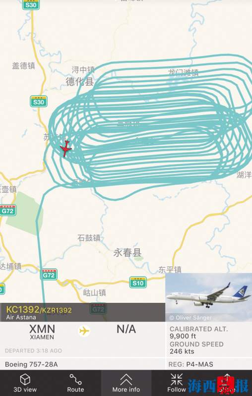 因疑似起落架故障,哈萨克斯坦阿斯塔纳航空KC1392航班在福建上空盘旋3个多小时、兜兜转转23圈,它在雷达屏幕上的每个动向,都牵动着万千市民和网友的心。