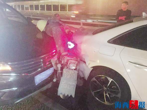 事故现场。 海西晨报讯(记者 白斌斌) 在现场,远远看只是两车追尾的小事故;但是走近看,就能发现两车中间还夹着一部摩托车。28日傍晚6时许,在杏林西滨立交桥上,两部小车发生追尾,导致一辆摩托车不幸被夹在中间,骑手受伤。 事发后,120和交警很快赶到了现场。在保护好骑手的情况下,黑色小车往后倒,骑手得以脱困。急救人员随即上前检查,发现骑手大腿骨折、变形,手臂也有不同程度受伤。初步固定处理后,骑手被送医救治。 记者了解到,伤者姓范,46岁,是一名泥水工人。事发时,他刚从工地准备回家,没想到路上遇到了车祸。目前,事故原因仍在调查中。 |