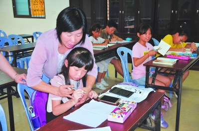 东孚街道山边书院四点钟学校内,志愿者在辅导孩子阅读。郑伟明 摄