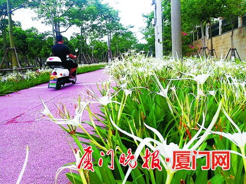 蜘蛛兰盛开,远望如白丝带。 厦门晚报讯(文/图记者戴舒静)昨天傍晚,翔安新店居民王先生带着儿子到翔安大道带状公园玩耍,走到联合博学园路段时,发现郁郁葱葱的灌木丛里,开出大片白色花朵。 仔细一看,每朵花摊开有成人手掌大,细长的五片花瓣像五根手指一样张开。大片花朵组成了两条长约数百米的“白色丝带”,一直延伸到首开领翔国际小区附近。 负责该区域绿化管养的翔安市政工作人员介绍,这种花叫“蜘蛛兰”,多种植在厦门一些公园和道路边侧的绿地,花期为夏秋季节。这种花的特点是花朵大,颜色亮,可以起到花化和彩化的作用。 据介绍,蜘蛛兰喜欢充足的光照和温暖湿润的气候,前段时间连续出现高温与雨水交替,催生大片蜘蛛兰盛开。 |