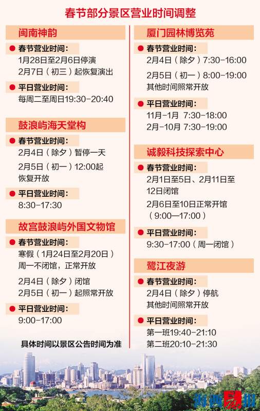 春节部分景区营业时间调整。黄劲超 图 瑞犬辞岁,金猪迎春。老辈人说,猪年是肥年,是丰收与福气的象征。值此新春佳节到来之际,相信每个人都对未来充满了期盼和愿景。 海西晨报讯(记者 陈翠仙)春节怎么过?厦门春节旅游精彩连连。记者从厦门市旅发委和在线旅游平台了解到,春节假期厦门各类旅游节庆活动已超过30项,丰富多彩的活动吸引了不少游客。据驴妈妈数据显示,今年厦门成为春节“年味旅游”十大热门目的地之一。 反向春运带来众多游客 与以往回老家过年的情况有所不同,近年来流行“反向春运”,在城市工作的子女把父母从老家接到身边一起过年。“反向春运”在厦门也受到追捧,厦门与上海、北京、广州、深圳、杭州等城市是今年“反向春运”的十大热门城市之一。据统计,除夕前一周飞往这些城市的机票预订量同比增长超过40%。 此外,在线旅游平台预定数据显示,今年春节期间,包含高星酒店、特色民宿产品的国内周边游产品预订量是去年同期的2.1倍,含有“年夜饭”“新春祈福游”关键字的周边产品预订量也同比上升,是去年同期的1.3倍。 酒店房价较平日略涨 记者从厦门市旅发委了解到,厦门酒店、景区等接待尚有一些余量。截至1月30日下午5时,全市63家星级酒店客房平均预订率超过六成,曾厝垵家庭旅馆预订率约七成,岛外酒店仍有较充裕的接待能力。 春节期间,厦门酒店房价较平日略有上涨,但依旧在门市价范围之内。据了解,截至1月30日,源昌凯宾斯基酒店、国际会展酒店、宸洲洲际酒店等平均预订房价均在1100元—1700元,翔鹭国际酒店高级房房价则低于850元,康莱德酒店、璞尚酒店等特色度假酒店的预订房价略高于3000元,市民、游客可按需求选择。 旅游节庆活动精彩纷呈 今年春节期间,厦门各区、各旅游景区纷纷举办各类特色鲜明的活动,目前活动数量已超过30项。 观音山梦幻海岸举办“萌猪闹春·金运连连”活动;园博苑将举办“金猪闹春园博纳福”活动,还有开运祈福赏花节、草雕艺术展和大地花卉展;大嶝小镇举办“赏金猪闹新春·购台货游大嶝”活动…… 春节期间丰富多彩的节庆活动,为厦门旅游增添了新的魅力,而鼓浪屿等经典景区依然热度不减。记者了解到,截至1月30日下午5时,鼓浪屿轮渡预售2月4日至10日春节假期游客过渡船票累计超过15万张,预售率超过60%,其中2月5日至7日预售率接近70%,想在春节期间到鼓浪屿的游客朋友要抓紧时间购票啦。 |